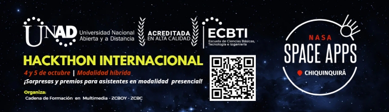 La Universidad Nacional Abierta y a Distancia (UNAD), a través de la Escuela de Ciencias Básicas, Tecnología e Ingeniería (ECBTI), la Zona Centro Boyacá (ZCBY), la Zona Centro Bogotá Cundinamarca (ZCBC) y el programa de Ingeniería Multimedia, invita a estudiantes, docentes, egresados y emprendedores a ser parte del NASA Space Apps Challenge 2025, uno de los hackáthones más grandes del mundo, que tendrá lugar los días 4 y 5 de octubre en el municipio de Chiquinquirá (Boyacá)